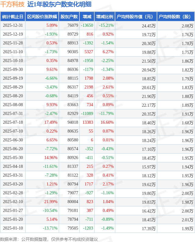 从股价来看,2025年12月19日至2025年12月31日,千方科技区间涨幅为5.09%,在此期间股东户数减少1.36万户,减幅为15.21%。