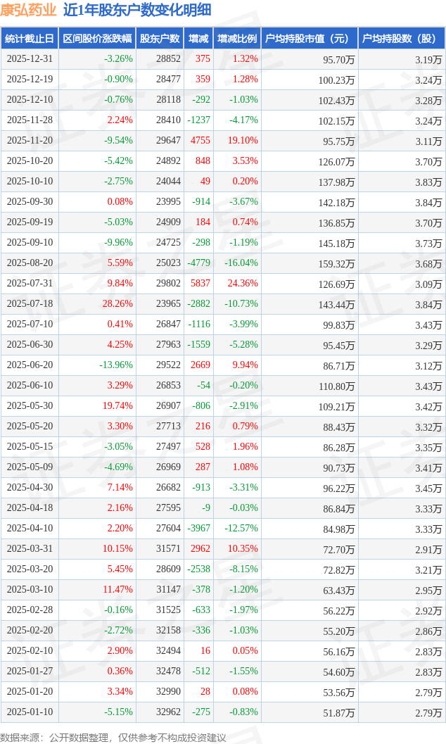 从股价来看,2025年12月19日至2025年12月31日,康弘药业区间跌幅为3.26%,在此期间股东户数增加375.0户,增幅为1.32%。
