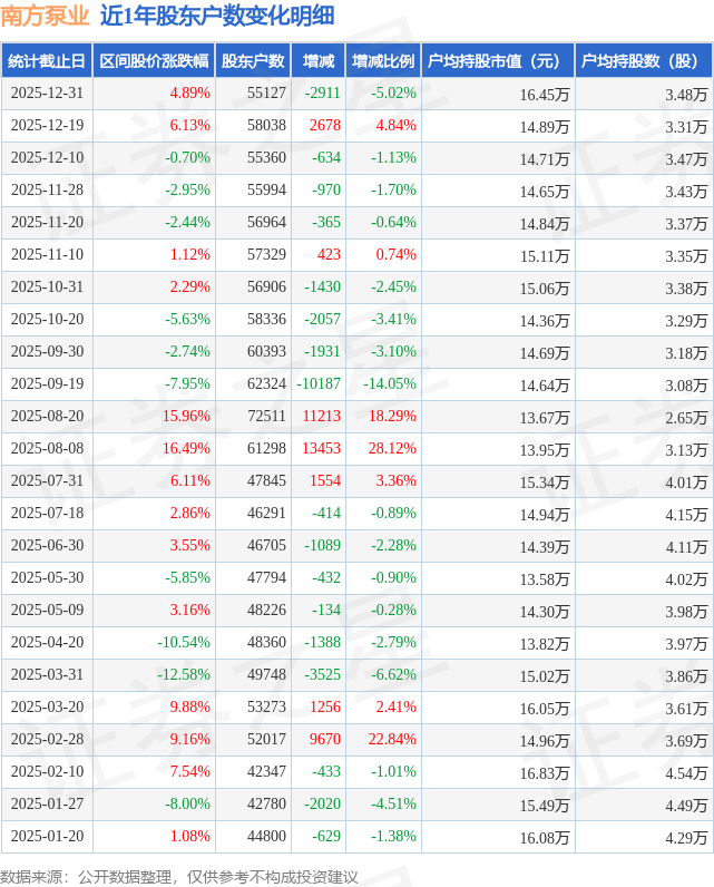从股价来看,2025年12月19日至2025年12月31日,南方泵业区间涨幅为4.89%,在此期间股东户数减少2911.0户,减幅为5.02%。