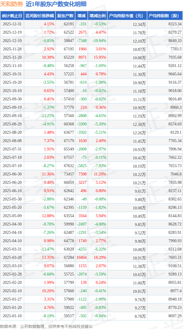 从股价来看,2025年12月19日至2025年12月31日,天和防务区间涨幅为4.15%,在此期间股东户数减少331.0户,减幅为0.53%。