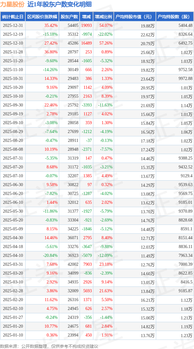 从股价来看,2025年12月19日至2025年12月31日,力星股份区间涨幅为35.42%,在此期间股东户数增加1.91万户,增幅为54.07%。