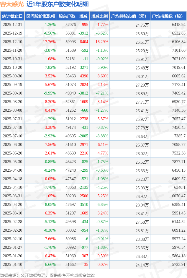 从股价来看,2025年12月19日至2025年12月31日,容大感光区间跌幅为1.26%,在此期间股东户数增加995.0户,增幅为1.77%。