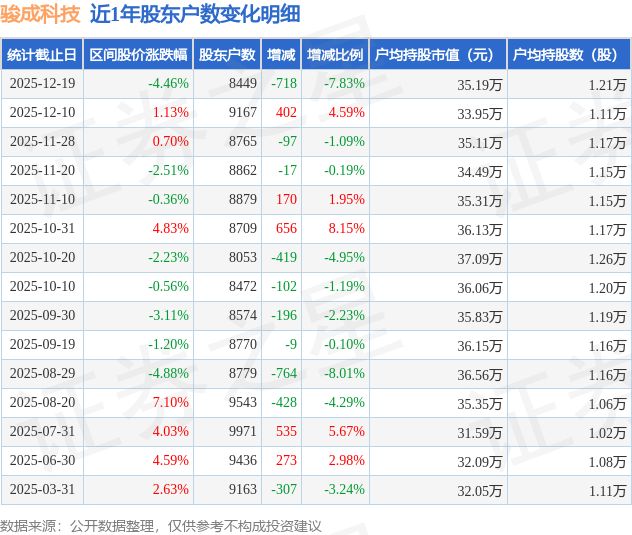 从股价来看,2025年12月10日至2025年12月19日,骏成科技区间跌幅为4.46%,在此期间股东户数减少718.0户,减幅为7.83%。
