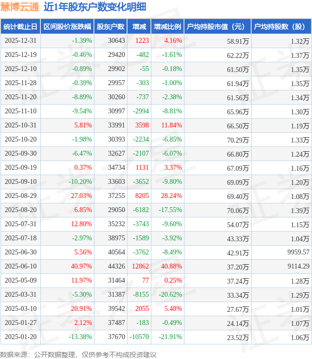 从股价来看,2025年12月19日至2025年12月31日,慧博云通区间跌幅为1.39%,在此期间股东户数增加1223.0户,增幅为4.16%。