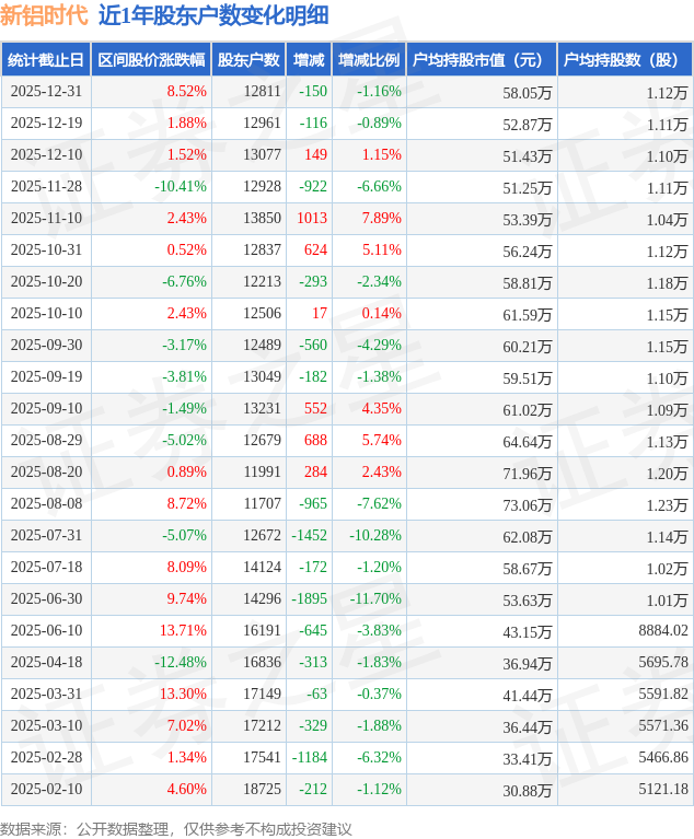 从股价来看,2025年12月19日至2025年12月31日,新铝时代区间涨幅为8.52%,在此期间股东户数减少150.0户,减幅为1.16%。