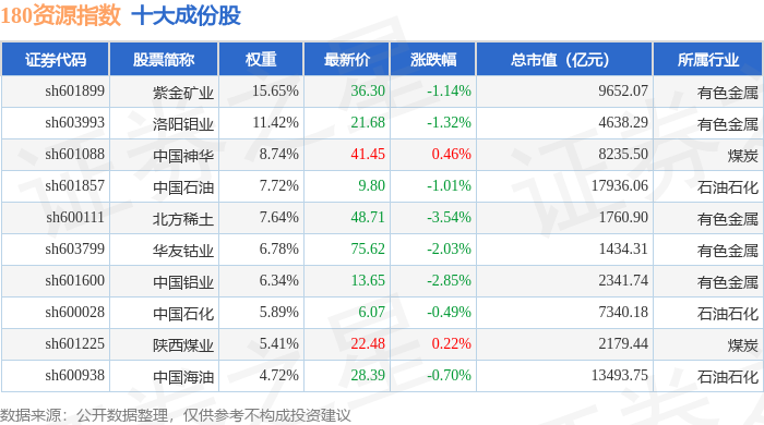 180资源(000026)指数十大成份股详情如下: