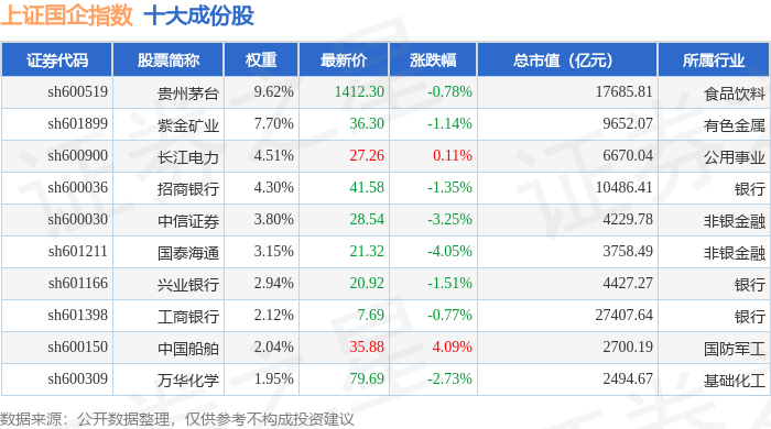 上证国企(000056)指数十大成份股详情如下:
