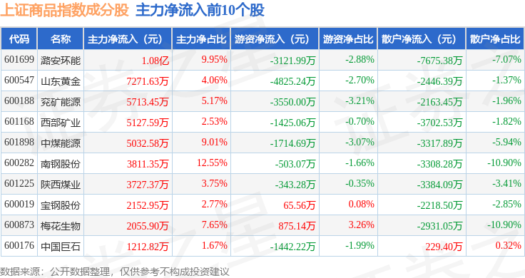 资金流向方面,上证商品(000066)指数成份股当日主力资金净流出合计66.53亿元,游资资金净流入合计16.48亿元,散户资金净流入合计50.05亿元。成份股资金流向详情见下表: