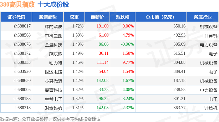380高贝(000137)指数十大成份股详情如下: