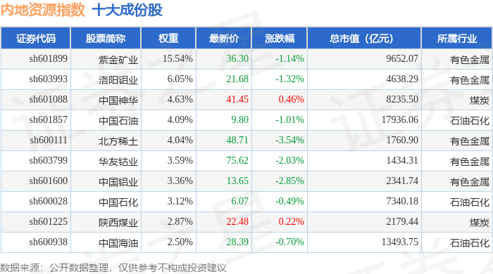 内地资源(000944)指数十大成份股详情如下: