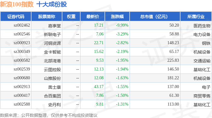 新浪100(399297)指数十大成份股详情如下: