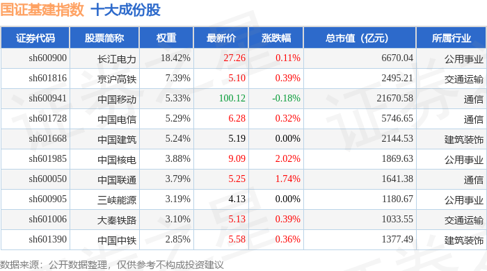 证券之星消息,1月8日,国证基建(399359)指数报收于2638.66点,涨0.41%,成交255.46亿元,换手率0.53%。当日该指数成份股中,上涨的有28家,中国核建以10.01%的涨幅领涨,下跌的有16家,锐捷网络以2.53%的跌幅领跌。