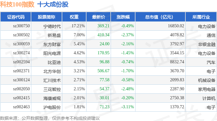 科技100(399608)指数十大成份股详情如下: