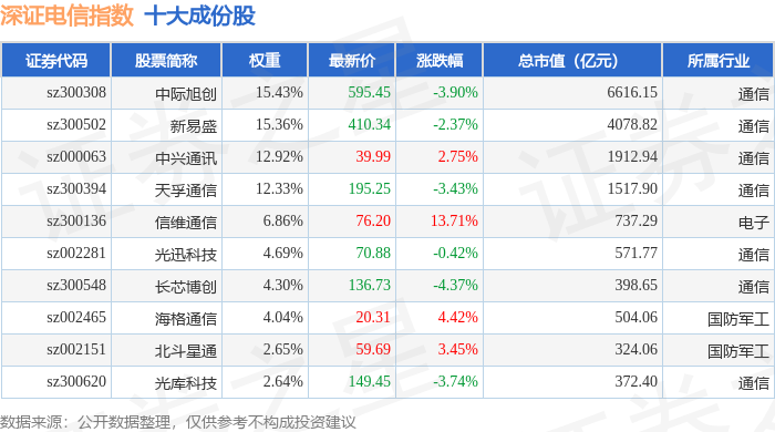 证券之星消息,1月8日,深证电信(399621)指数报收于13238.9点,涨0.05%,成交951.58亿元,换手率8.53%。当日该指数成份股中,上涨的有8家,信维通信以13.71%的涨幅领涨,下跌的有12家,中瓷电子以6.11%的跌幅领跌。