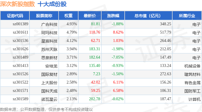 证券之星消息,1月8日,深次新股(399678)指数报收于628.65点,涨0.94%,成交238.92亿元,换手率6.09%。当日该指数成份股中,上涨的有69家,矽电股份以14.86%的涨幅领涨,下跌的有31家,思泉新材以7.05%的跌幅领跌。