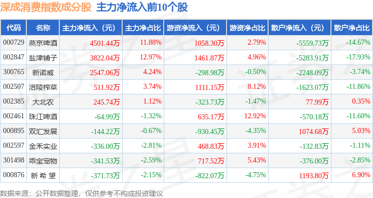 资金流向方面,深成消费(399684)指数成份股当日主力资金净流出合计4.51亿元,游资资金净流入合计1.25亿元,散户资金净流入合计3.26亿元。成份股资金流向详情见下表: