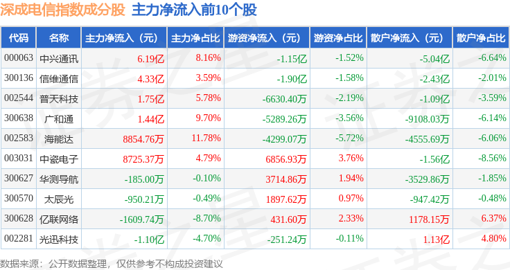 资金流向方面,深成电信(399688)指数成份股当日主力资金净流出合计55.39亿元,游资资金净流入合计47.4亿元,散户资金净流入合计7.98亿元。成份股资金流向详情见下表: