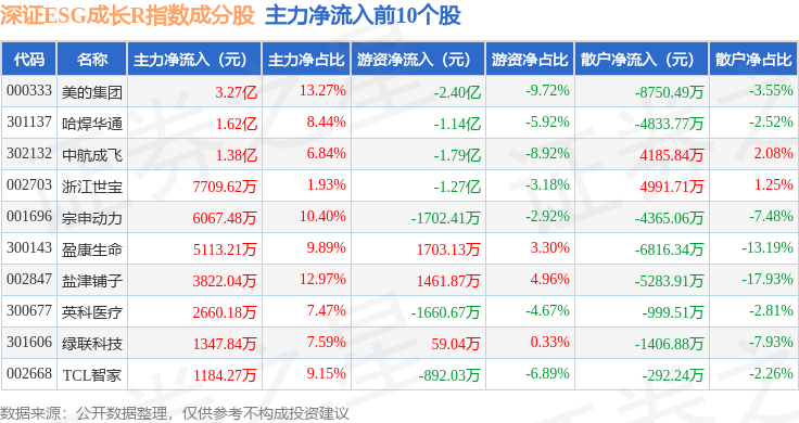 资金流向方面,深证ESG成长R(470060)指数成份股当日主力资金净流出合计135.46亿元,游资资金净流入合计62.51亿元,散户资金净流入合计72.94亿元。成份股资金流向详情见下表: