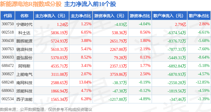 资金流向方面,新能源电池R(480027)指数成份股当日主力资金净流出合计15.77亿元,游资资金净流入合计3.56亿元,散户资金净流入合计12.21亿元。成份股资金流向详情见下表:
