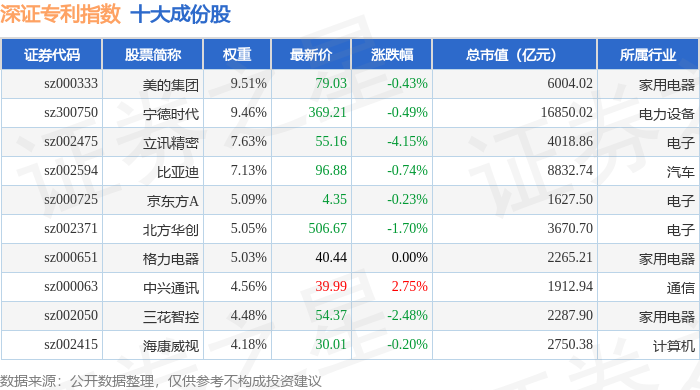 证券之星消息,1月8日,深证专利(970067)指数报收于5026.72点,跌0.36%,成交1187.69亿元,换手率2.32%。当日该指数成份股中,上涨的有26家,金风科技以10.0%的涨幅领涨,下跌的有23家,立讯精密以4.15%的跌幅领跌。
