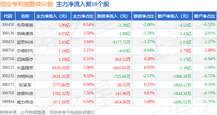 资金流向方面,创业专利(970068)指数成份股当日主力资金净流出合计6.95亿元,游资资金净流出合计2.92亿元,散户资金净流入合计9.88亿元。成份股资金流向详情见下表: