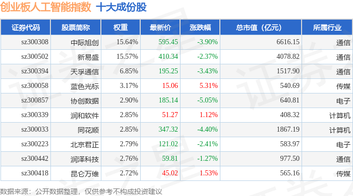 证券之星消息,1月8日,创业板人工智能(970070)指数报收于6098.65点,跌0.88%,成交1240.23亿元,换手率8.76%。当日该指数成份股中,上涨的有30家,汉得信息以13.35%的涨幅领涨,下跌的有20家,协创数据以5.05%的跌幅领跌。