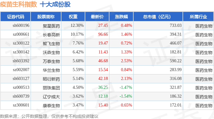 疫苗生科(980015)指数十大成份股详情如下: