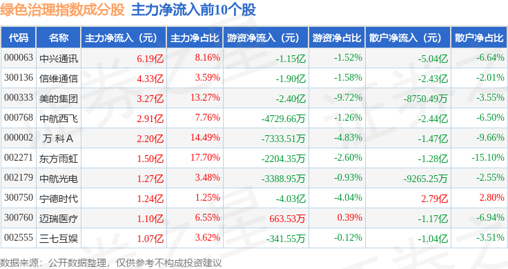 资金流向方面,绿色治理(980058)指数成份股当日主力资金净流出合计48.65亿元,游资资金净流入合计16.25亿元,散户资金净流入合计32.4亿元。成份股资金流向详情见下表: