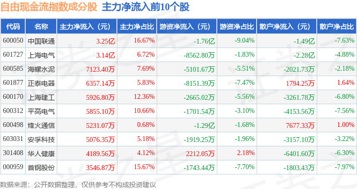 资金流向方面,自由现金流(980092)指数成份股当日主力资金净流出合计17.28亿元,游资资金净流入合计5.93亿元,散户资金净流入合计11.35亿元。成份股资金流向详情见下表: