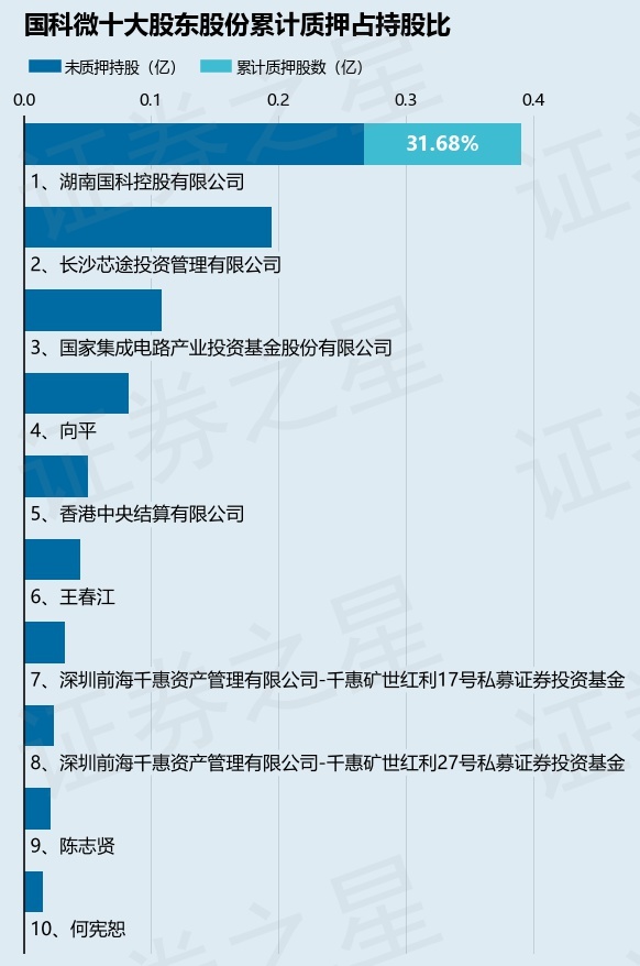 截止本公告日,股东湖南国科控股有限公司已累计质押股份1236.5万股,占其持股总数的31.68%。本次质押后国科微十大股东的累计质押股份占持股比例(占持股比例的计算以公司最新一期财务报表公布的十大股东的持股总数为基准)见下图:
