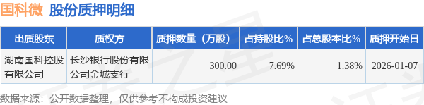 证券之星消息,国科微(300672)1月8日公开信息显示,股东湖南国科控股有限公司向长沙银行股份有限公司金城支行合计质押300.0万股,占总股本1.38%。质押详情见下表: