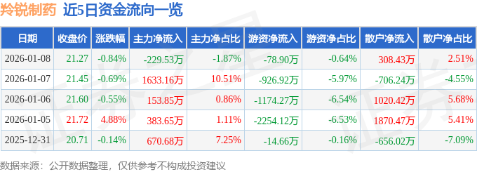 证券之星消息,截至2026年1月8日收盘,羚锐制药(600285)报收于21.27元,下跌0.84%,换手率1.02%,成交量5.75万手,成交额1.23亿元。