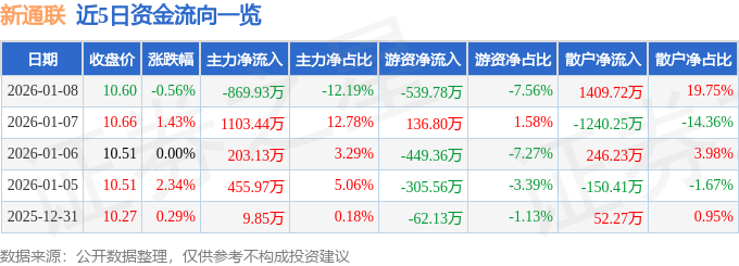 证券之星消息,截至2026年1月8日收盘,新通联(603022)报收于10.6元,下跌0.56%,换手率3.36%,成交量6.71万手,成交额7137.57万元。