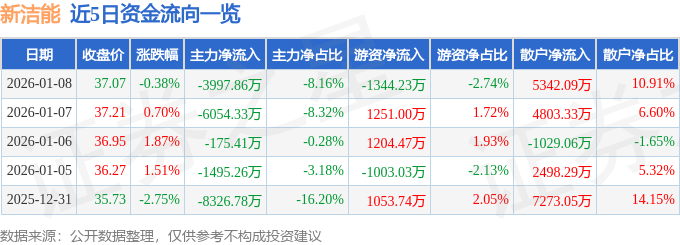 证券之星消息,截至2026年1月8日收盘,新洁能(605111)报收于37.07元,下跌0.38%,换手率3.18%,成交量13.21万手,成交额4.9亿元。