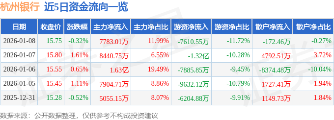 证券之星消息,截至2026年1月8日收盘,杭州银行(600926)报收于15.75元,下跌0.32%,换手率0.57%,成交量41.24万手,成交额6.49亿元。