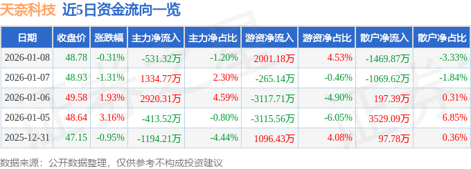 证券之星消息,截至2026年1月8日收盘,天奈科技(688116)报收于48.78元,下跌0.31%,换手率2.46%,成交量9.01万手,成交额4.42亿元。