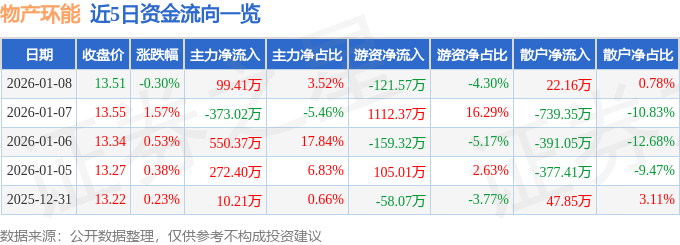 证券之星消息,截至2026年1月8日收盘,物产环能(603071)报收于13.51元,下跌0.3%,换手率0.37%,成交量2.08万手,成交额2827.86万元。