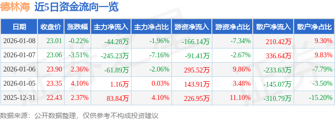 证券之星消息,截至2026年1月8日收盘,德林海(688069)报收于23.01元,下跌0.22%,换手率0.87%,成交量9801.0手,成交额2262.81万元。