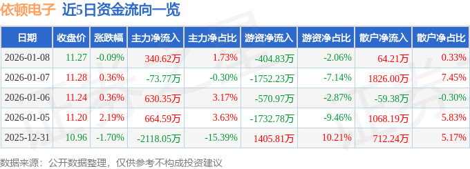 证券之星消息,截至2026年1月8日收盘,依顿电子(603328)报收于11.27元,下跌0.09%,换手率1.75%,成交量17.48万手,成交额1.97亿元。