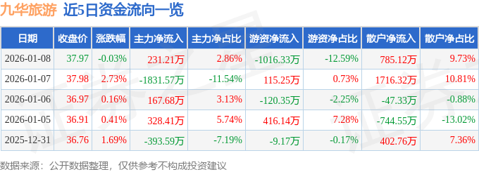 证券之星消息,截至2026年1月8日收盘,九华旅游(603199)报收于37.97元,下跌0.03%,换手率1.93%,成交量2.14万手,成交额8072.11万元。