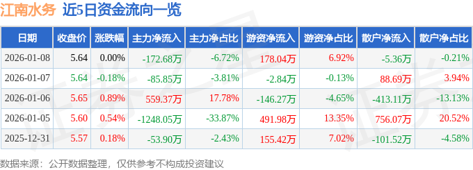 证券之星消息,截至2026年1月8日收盘,江南水务(601199)报收于5.64元,上涨0.0%,换手率0.49%,成交量4.56万手,成交额2571.02万元。