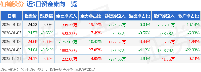 证券之星消息,截至2026年1月8日收盘,仙鹤股份(603733)报收于24.52元,上涨0.0%,换手率0.41%,成交量2.88万手,成交额7037.24万元。