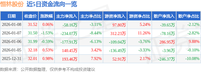 证券之星消息,截至2026年1月8日收盘,恒林股份(603661)报收于31.52元,上涨0.06%,换手率0.43%,成交量5930.0手,成交额1868.16万元。