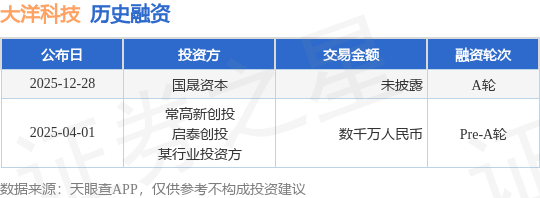 证券之星消息,根据天眼查APP于12月28日公布的信息整理,大洋智能(江苏)科技产业有限公司A轮融资,融资额未披露,参与投资的机构包括国晟资本。