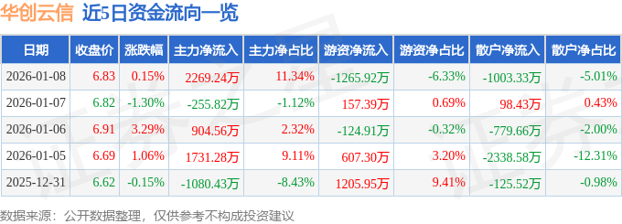 证券之星消息,截至2026年1月8日收盘,华创云信(600155)报收于6.83元,上涨0.15%,换手率1.33%,成交量29.39万手,成交额2.0亿元。