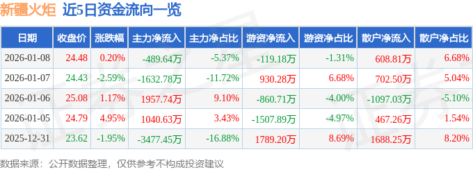 证券之星消息,截至2026年1月8日收盘,新疆火炬(603080)报收于24.48元,上涨0.2%,换手率2.62%,成交量3.71万手,成交额9113.43万元。
