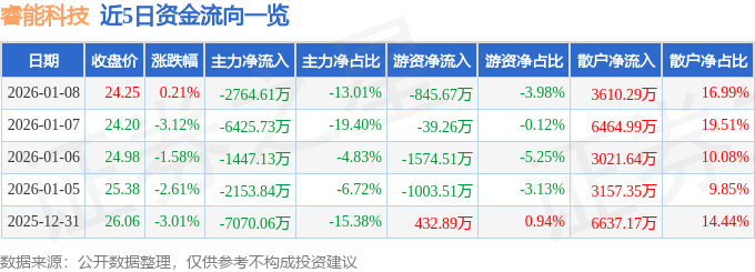 证券之星消息,截至2026年1月8日收盘,睿能科技(603933)报收于24.25元,上涨0.21%,换手率4.23%,成交量8.78万手,成交额2.13亿元。