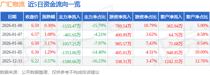 1月8日的资金流向数据方面,主力资金净流出1155.47万元,占总成交额15.79%,游资资金净流入789.54万元,占总成交额10.79%,散户资金净流入365.94万元,占总成交额5.0%。