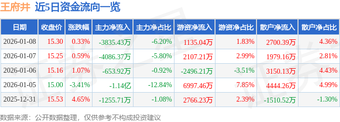 证券之星消息,截至2026年1月8日收盘,王府井(600859)报收于15.3元,上涨0.33%,换手率3.61%,成交量40.58万手,成交额6.19亿元。