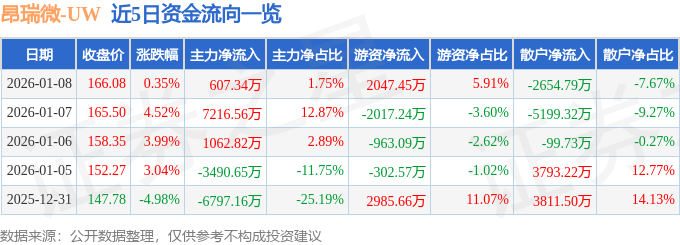 证券之星消息,截至2026年1月8日收盘,昂瑞微(688790)报收于166.08元,上涨0.35%,换手率17.45%,成交量2.1万手,成交额3.46亿元。